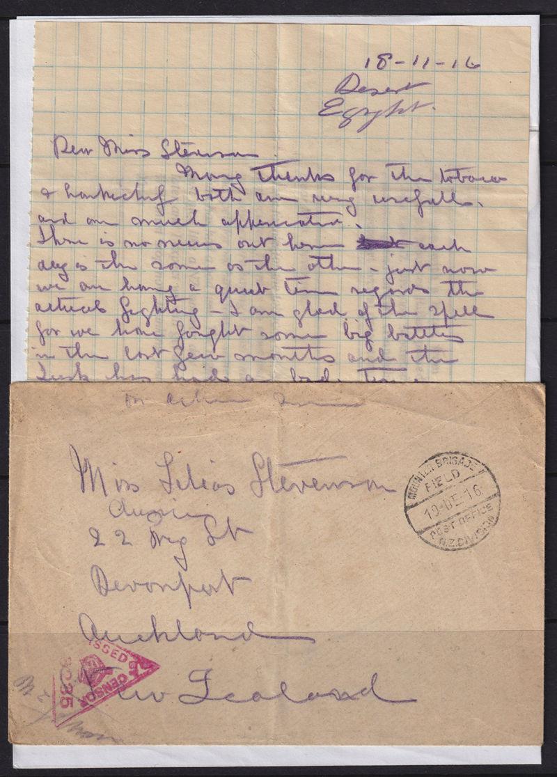 1916 (19DE) Stampless WW1 Cover to NZ together with a letter written by Sergeant ME Johnson of the Auckland Mounted Rifels Posted at Serapeum,Egypt. Has a light Mounted Brigade/Field Post Office/NZ Division cancel. Censor No 3235 at right with a Devonport 2 FE 17 receiving cancel. The cover has ligh