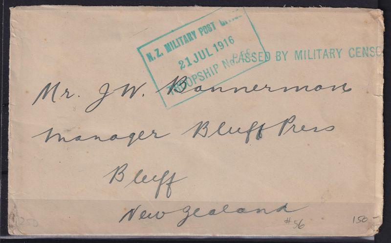 1916 (21JL) Troopship Stampless Cover to NZ with boxed ‘NZ Military Post Office/Troopship No 56’ plus Passed By Military censor green cachet. Used on HMNZT Maunganui. Backstamped Bluff. Minor ageing (1)