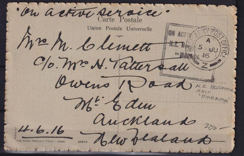 1916 (5JU) Egyptian Picture Postcard Stampless with Boxed ‘On Active Service/NZ Hospital Ship/Marama’ in black plus Base Army Post Office cancel to NZ. Fine Item (1)