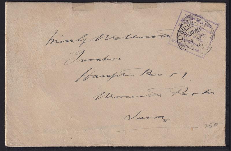1916 (8MY) Stampless Cover with boxed violet ‘Posted by New/Zealand Wounded/Soldier at the New/Zealand Military/Hospital/Walton-on-Thames’ with Walton-On-Thames cancel to a local address. Fine & Very Scarce (1)