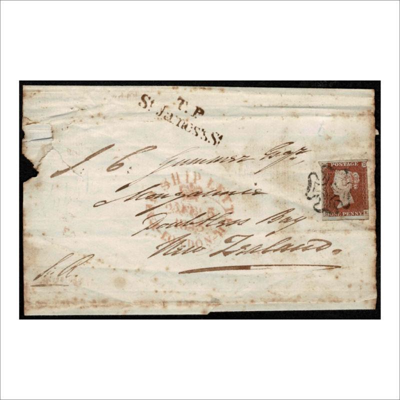 1843 Early Wrapper with GB QV 1d Red Imperf tied by Black Maltese Cross addressed to Mongonui, New Zealand. Has Ship Letter/London red & TP/St James St handstamps. Some staining. Rare Inwards Mail to NZ in 1843 (1)