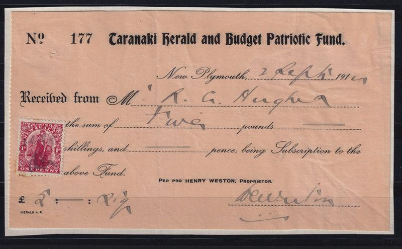 1914 Taranaki Herald and Budget Patriotic Fund Printed Receipt with 1d Dominion initialled. Patriotic related item (1)