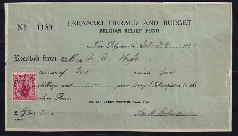 1915 Taranaki Herald and Budget/Belgian Relief Fund Printed Receipt with 1d Dominion initialled. Patriotic related item (1)