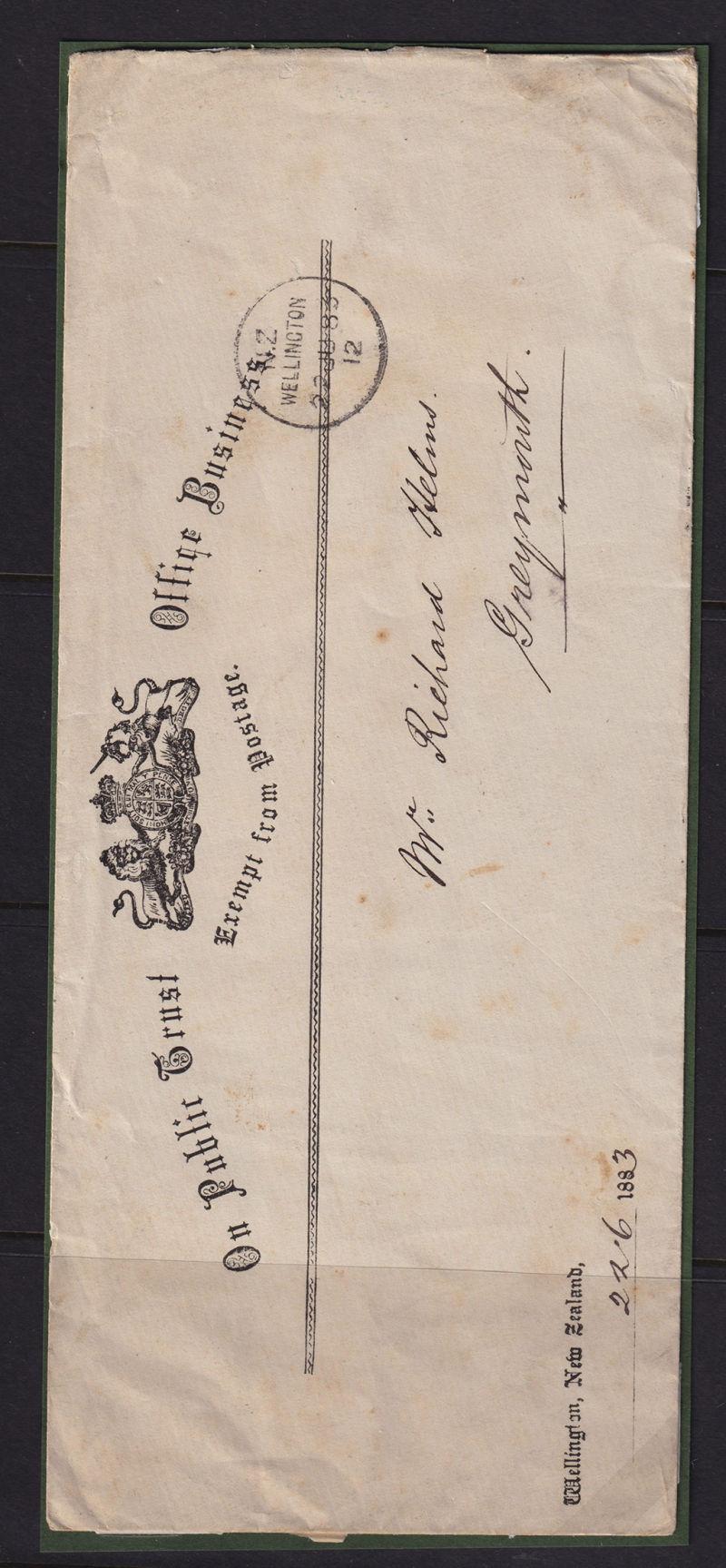 1883 (22JU) Long On Public Trust Office Business Printed Cover Posted at Wellington to Greymouth. Backstamped Greymouth. Light ageing. Scarce (1)