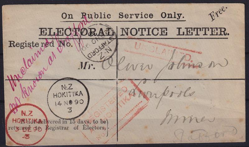 1890 (14NO) OPSO/Electoral Notice Letter Printed Registered Cover Posted at Hokitika to Stafford with receiving cancel. Has in Manuscript ‘Unclaimed/Not known at Stafford’ marking. Boxed Registered/Hokitika cachet and Unclaimed cachet. The cover lightly aged. (1)