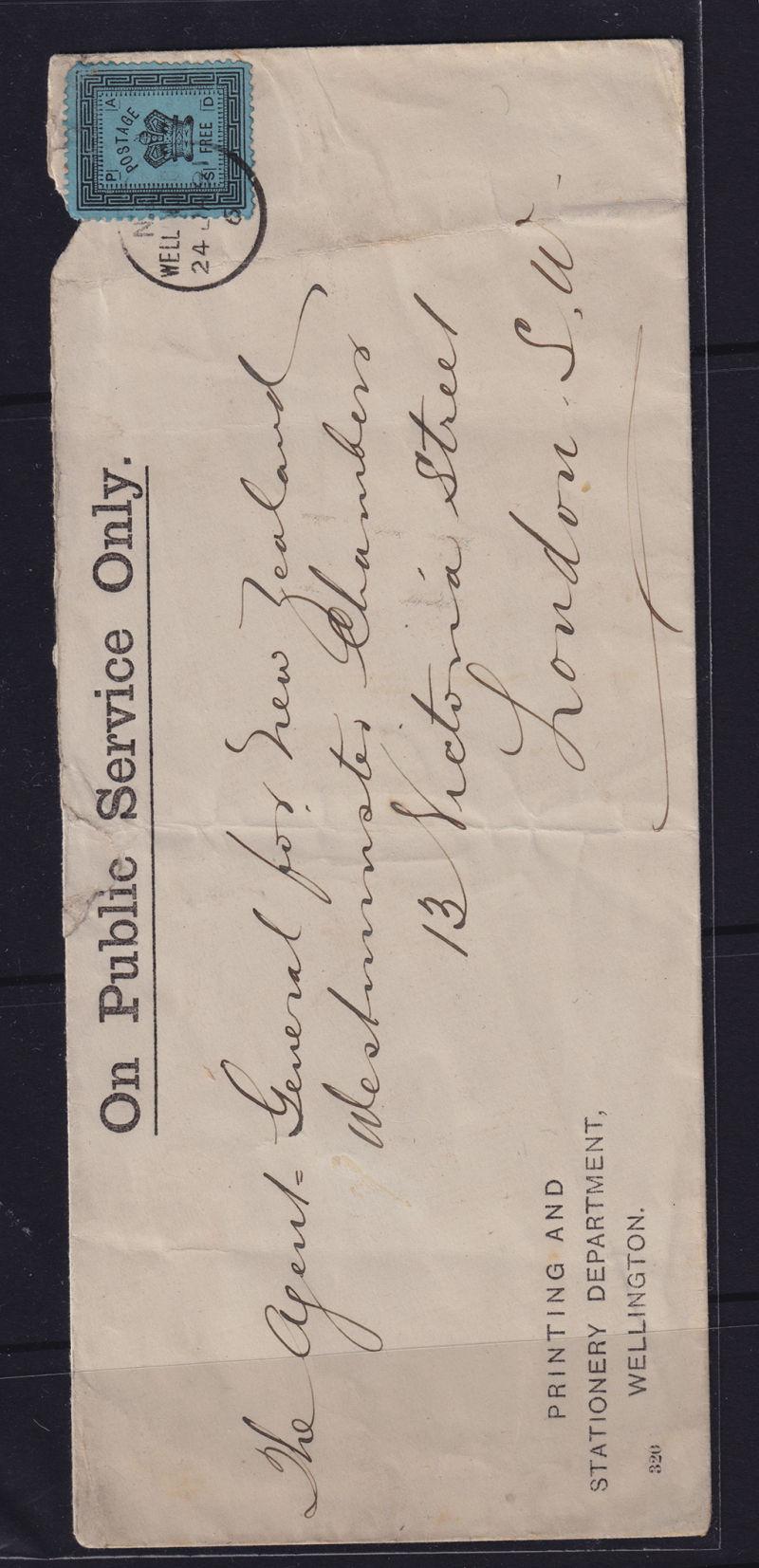1891 (24JA) Long OPSO/Printing and Stationery Department Wellington Cover with Blue PASD Free Stamp tied by Wellington cancel to London. No backstamp. The cover has a light vertical crease. One of 3 Covers known with the PASD Free Stamp. Very Scarce on Cover (1)