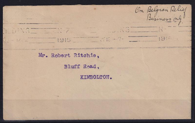 1915 JE18) Stampless Cover endorsed ‘On Belgian Relief Business only’ cancelled by Feilding machine cancel to KIMBOLTON. Backstamped Kimbolton. Fine Patriotic Reelated Cover (1)