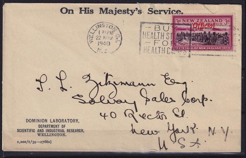 1940 (22NO) Small OHMS/Dominion Laboratory,Department of Scientific and Industrial Research,Wellington printed Cover to USA with 3d Centennial Official tied by Wellington machine cancel. No backstamps. Fine single rate cover (1)