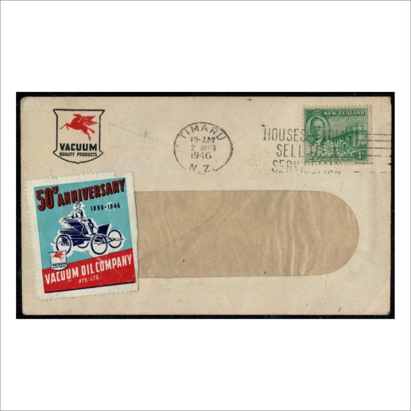 1946 (2AU) Vacuum Oil Company Printed window envelope with 1d Peace perfined ‘VOCo’ tied by Timaru machine cancel. Also 50th Anniv 1896-1946 Vacuum Oil Company Pty Ltd untied label at left. (1)
