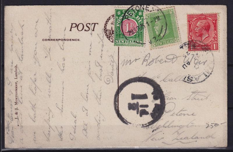 1925 (24AU) Inwards Picture Postcard from London with 1 1/2d Postage Due cachet. Has 1d Due & KGV 1/2d Surface values tied by Petone cancel. Interesting use of non Postage Due stamps. (1)