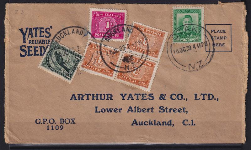1939 (16OC) Arthur Yates Printed Cover with KGVI 1d Green Posted at OTAKI to Auckland. Has ‘39 3rd Type Dues 1d,3d(3) plus ‘35 1/- Pictorial values tied. Additional use of Non-Postage Due values. (1)