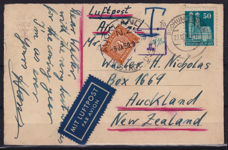 1949 (27DE) Picture Postcard from Germany with Postage Due T/30 marking. Has NZ 3d Brown 3rd Type due tied by Auckland Postage Due cancel. Fine item (1)