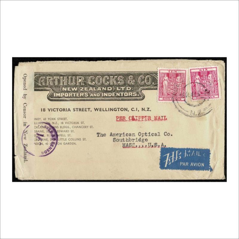 1941 (16DE) Arthur Cocks & Co Printed Advertising Cover to USA Per Clipper Mail with Arms 10/- & 6/- values tied by Wellington cancels. Censored. On the back has 2x Wellington Advertsing labels untied. (1)