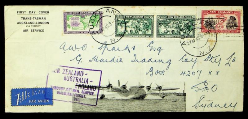 New Zealand 1940 4v on First Flight Airmail cover from Auckland to Sydney Australia