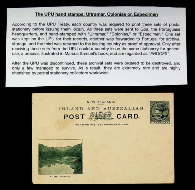 New Zealand Inland & Australia Galatea Auckland view QV 1d unused postcard Proof h/s "ULTRAMAR" by UPU Portuguese Receiving authorities at Goa India