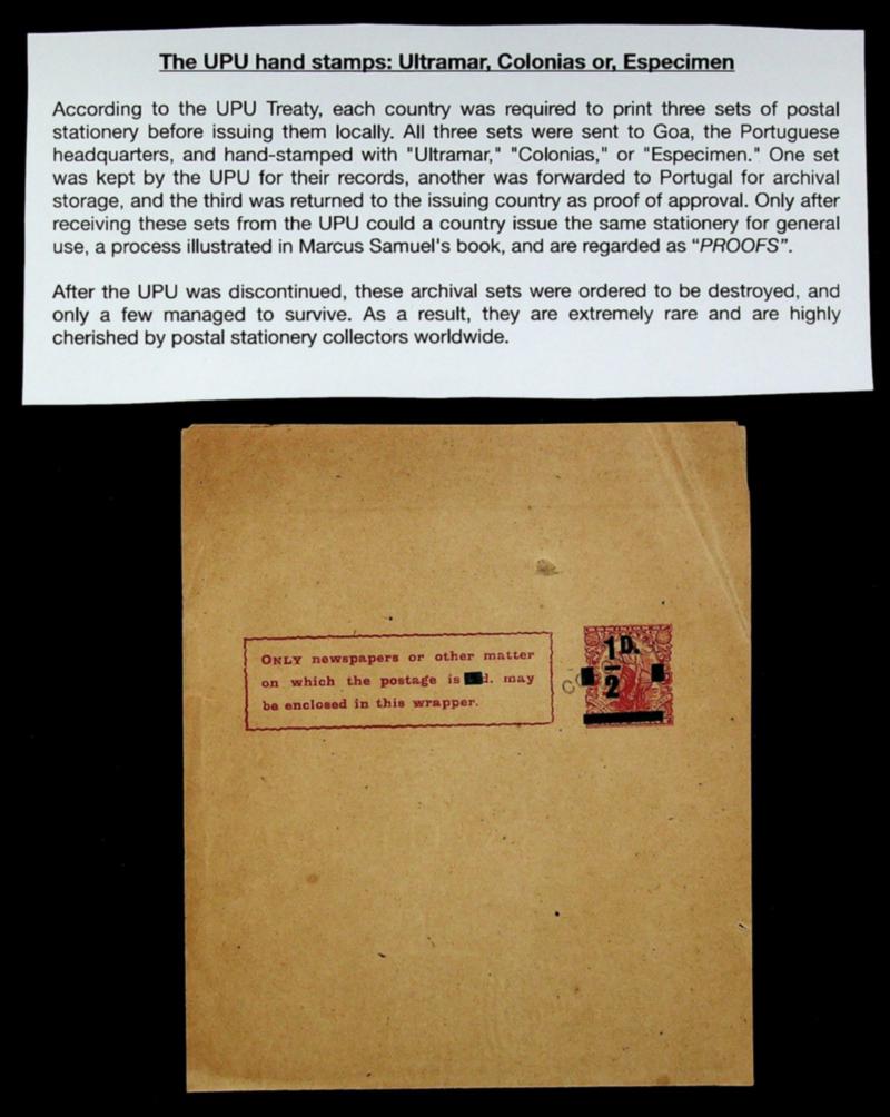 New Zealand KGV ½d s/c unused wrapper Proof h/s "COLONIAS" by UPU Portuguese Receiving authorities at Goa India