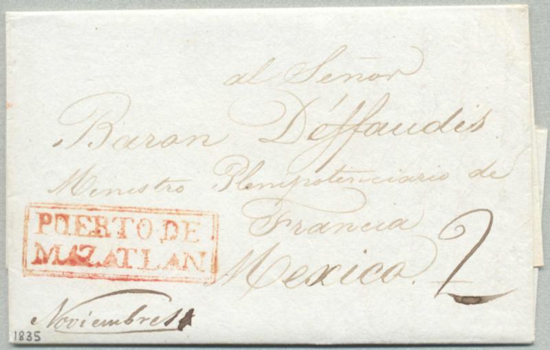 1835, prephilatelic letter from MAZATLAN to MEXICO, cancelled with red boxed PUERTO DE MAZATLAN, taxed m/s 2 Reals, excitingly fresh letter in perfect condition, XF! Schätzpreis 300€.