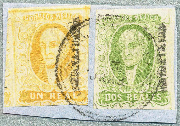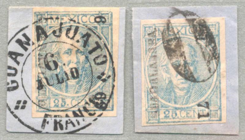 1868, 25c, (2) on piece, blue, imperf, GUANAJUATO district and GUADALAJARA district, cancelled with double circular GUANAJUATO FRANCO (Schatzke 477) and mute cancel of GUADALAJARA (Schatzke 369), ex Provera, exceptionally fresh and desirable, XF! Schätzpreis 300€.