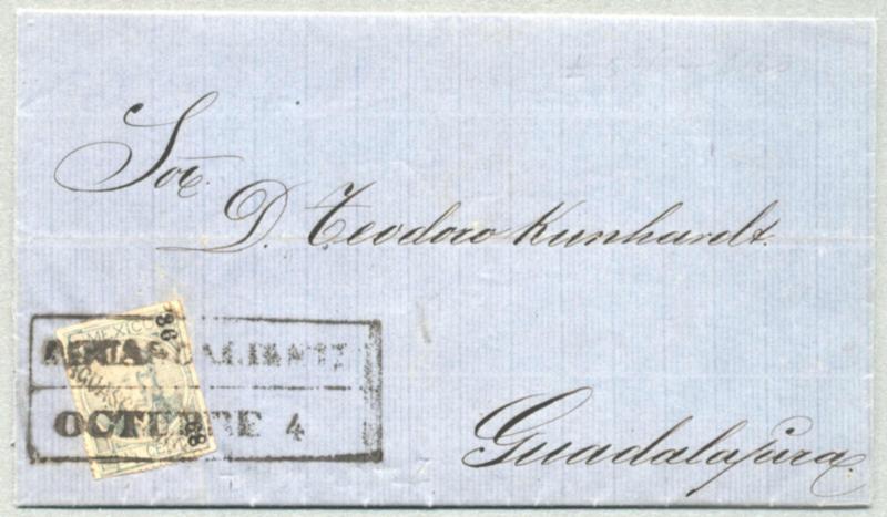 1871, 25c, blue, perf, retouch in top left corner, AGUASCALIENTES district, on letter from AGUASCALIENTES to GUADALAJARA, cancelled with AGUASCALIENTES OCTUBRE 4 (Schatzke 11), ex Provera, fresh and desirable entire, XF! Schätzpreis 400€.