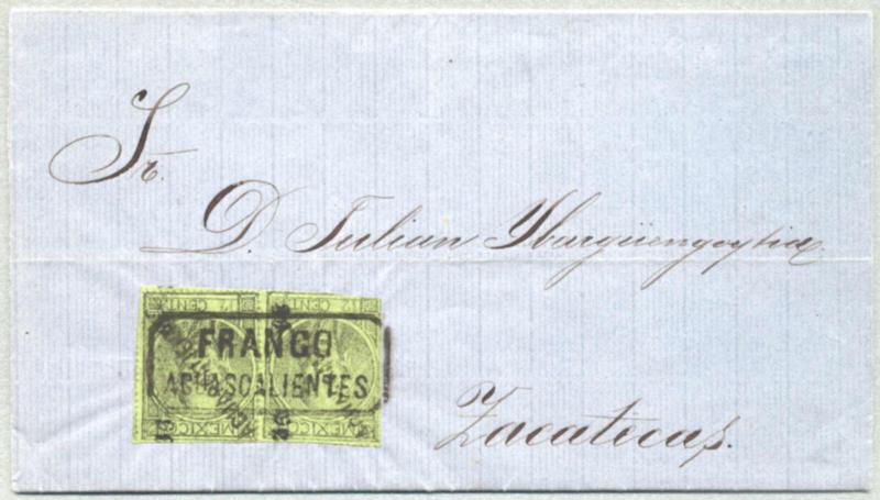 1868, 12c, (2), black/green, perf, AGUASCALIENTES district, on letter from AGUASCALIENTES to ZACATECAS, cancelled with FRANCO AGUASCALIENTES (Schatzkes 14), ex Provera, cut at lower left, still fresh and desirable, F-VF! Schätzpreis 400€.