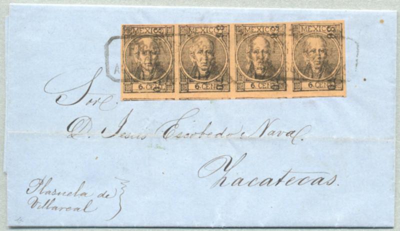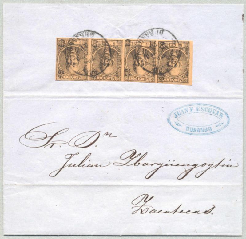 1870, 6c, black/buff, strip of four, imperf, rare early stones thin figures issue, DURANGO district, stamps are on reverse of letter - opened for display, on letter from DURANGO to ZACATECAS, cancelled with double circular DURANGO (Schatzkes 238), middle stamps touched at top, franking is on reverse