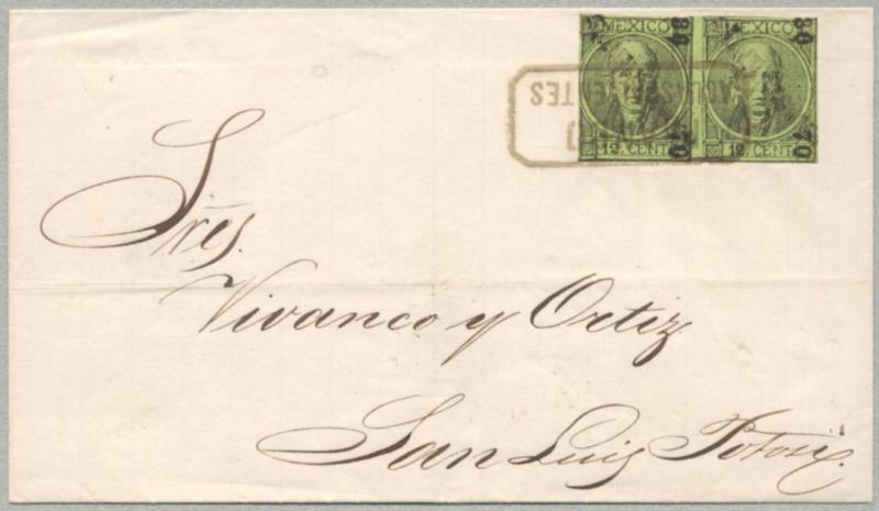 1870, 12c, black/green, pair, imperf, AGUASCALIENTES district, on letter from AGUASCALIENTES to SAN LUIS POTOSI, cancelled with AGUASCALIENTES (Schatzkes 14), ex Provera, cut along the border, on all sides except right, still fresh and desirable, F-VF! Schätzpreis 700€.