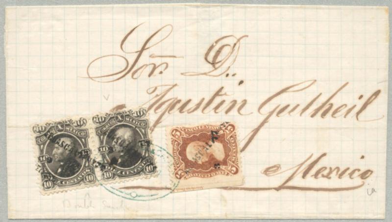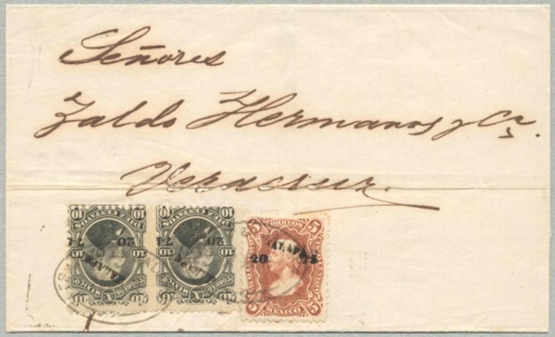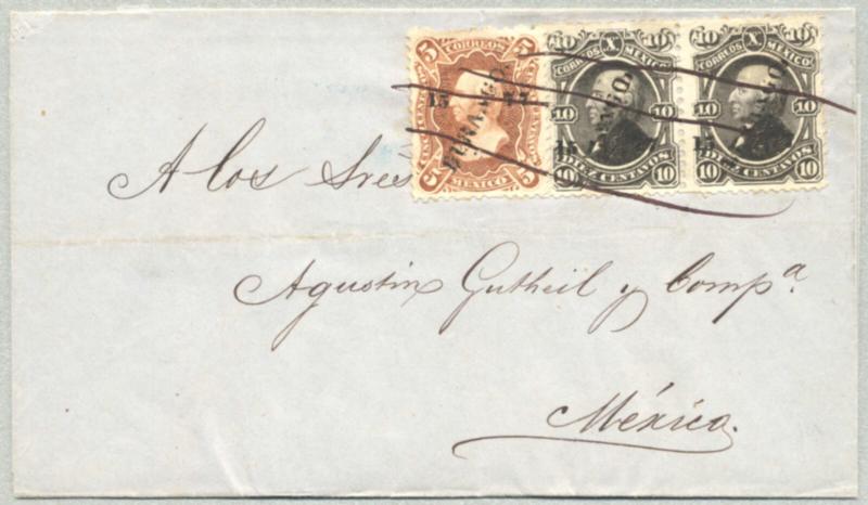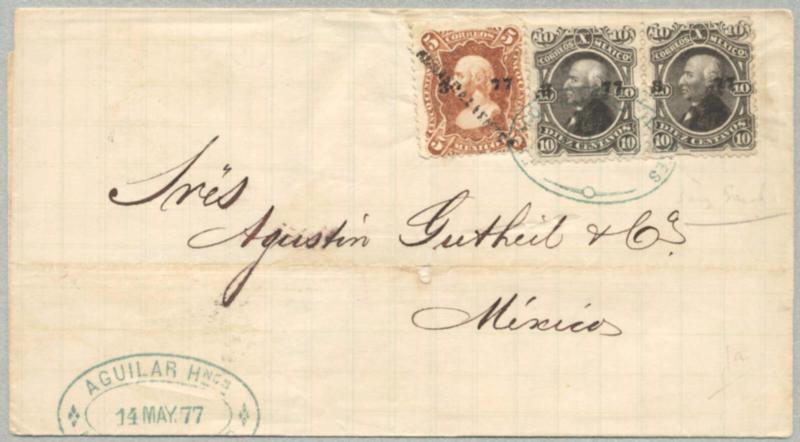 1877, 5+10+10c, (3), 10c as pair, 5c left margin piece with printers inscription, side cut with scissors, numerals wide apart, AGUASCALIENTES district - left side partly double, on letter from AGUASCALIENTES to MEXICO, cancelled with blue FRANCO EN AGUASCALIENTES (not listed in Schatzkes, Schimmer A