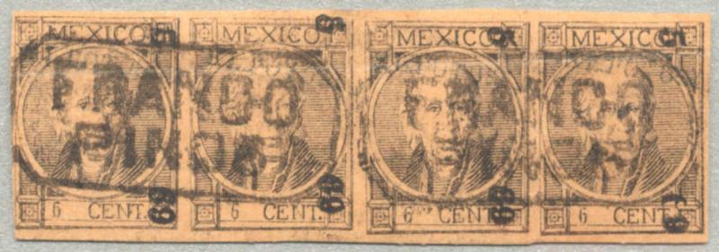 1869, strip of (4), 6 c., black on buff paper, Hidalgo face thin figures issue, with district opt. S.L.POTOSI, with two rare strikes FRANCO PINOS, horizontal crease through the stamps, still fresh and desirable, F! Schätzpreis 600€.