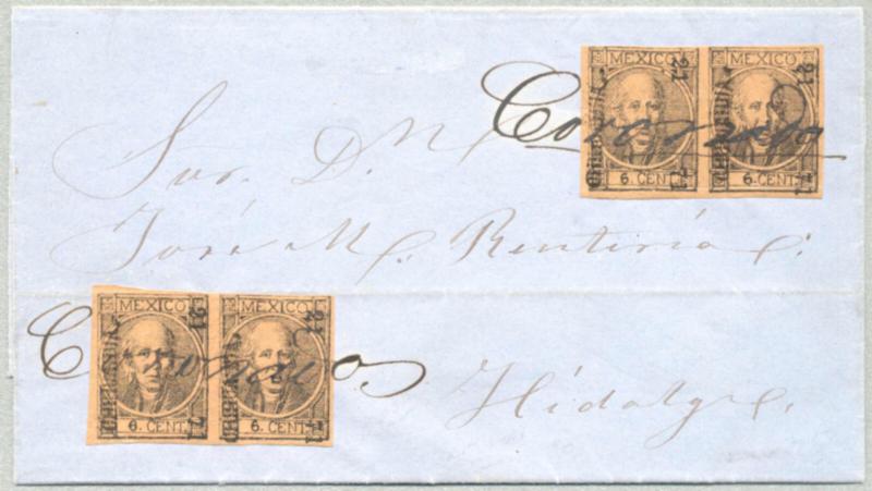 1871, 6c, black/buff, two horizontal pairs, imperf, CHIHUAHUA district, on letter from CORONADOS to HIDALGO, manuscript cancellation of CORONADOS - not listed in Schatzkes, ex Provera, exceptionally fresh and desirable entire, XF! Schätzpreis 1.200€.