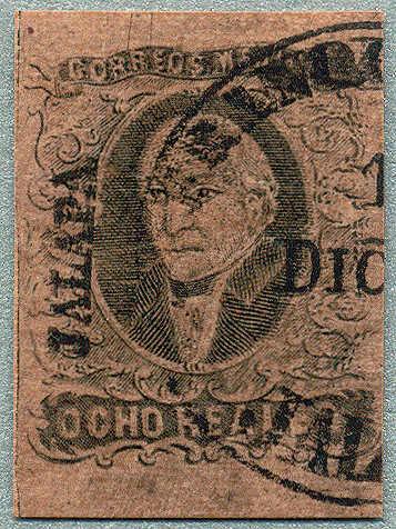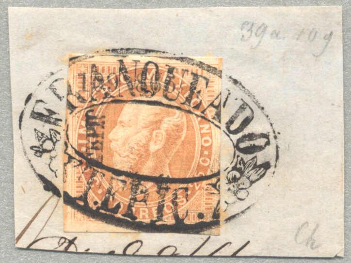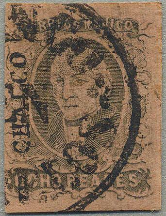 1861, 8 r, black/brown, imperf, with district CHALCO, used - FRANCO MORELOS - Schatzkes 94, very scarce value for this district, CV $1750 according to Follansbee, an exceptional stamp, VF-XF! Schätzpreis 1.750€.