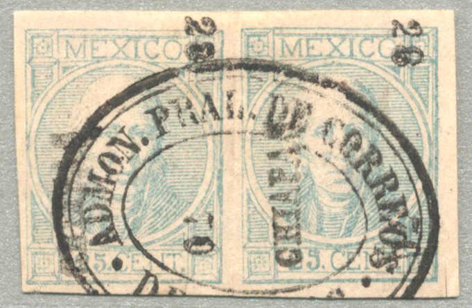 1868, 25c, blue, imperf, no district, cancelled with ADMINISTRACION DE CORREOS PICHUCALCO (Schatzke 127), 2 precuts at lower left - one cut into frameline, ex Provera, fresh and desirable, VF! Schätzpreis 150€.