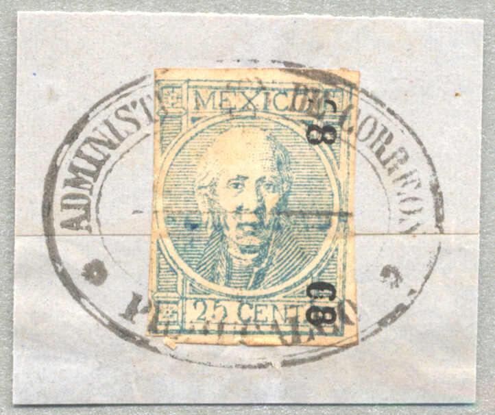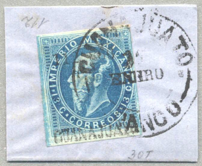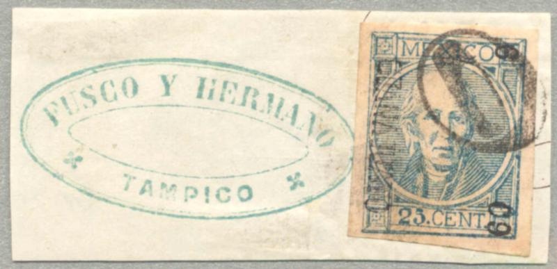 1869-1870, 25c, blue, on piece, imperf, GUANAJUATO district, mute cancellation (Schatzkes 522) and aside company cachet, ex Provera, exceptionally fresh and desirable, XF! Estimate 250€.