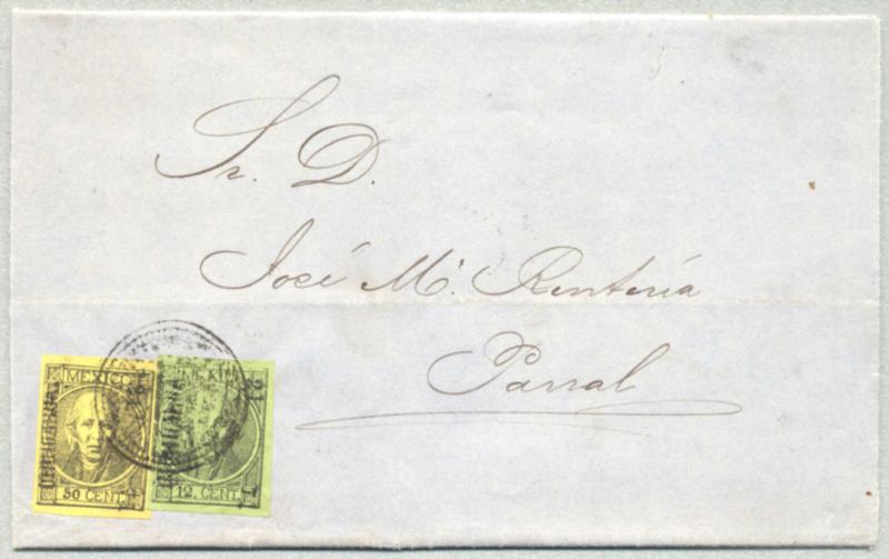 1871, 50c+12c, imperf, CHIAHUAHUA district, on letter from CHIAHUAHUA to PARRAL, indestinct cancel, rare combination of 12 cts and 50cts 21-71 opt., ex Provera, fresh and desirable entire, VF! Schätzpreis 800€.