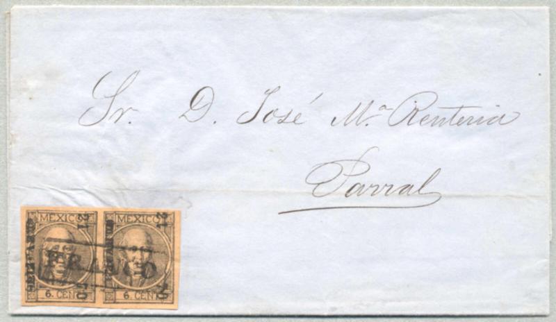 1870, 6c, black/buff, pair, imperf, CHIHUAHUA district, on letter from ROSALIA to PARRAL, cancelled with boxed FRANCO (Schatzkes not listed), ex Provera, exceptionally fresh and desirable entire, XF! Schätzpreis 600€.