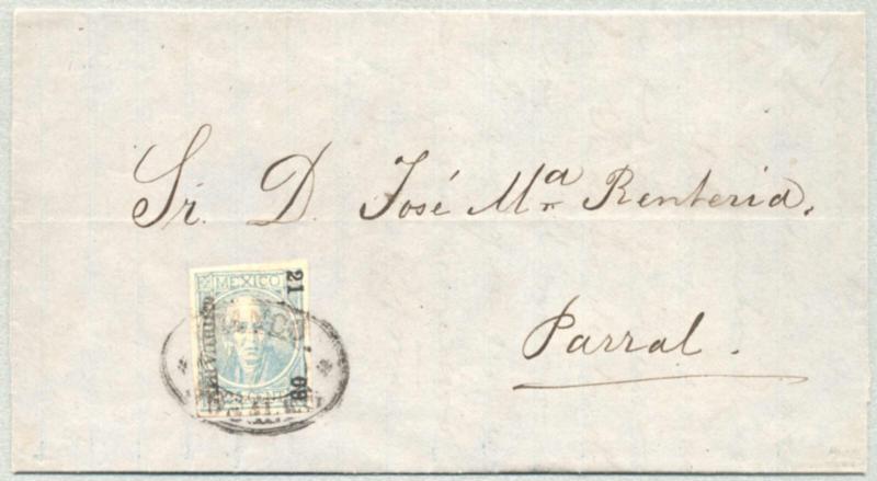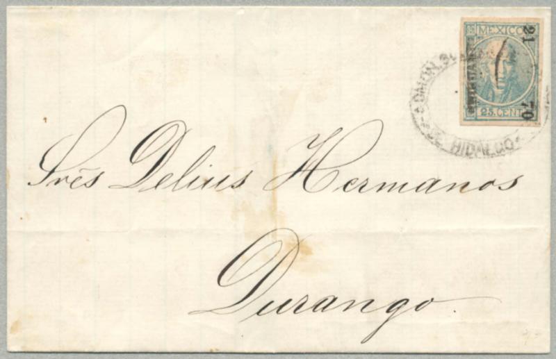 1871, 25c, blue, imperf, CHIHUAHUA district, on letter from HIDALGO DEL PARRAL to DURANGO, cancelled with DE HIDALGO (Schatzkes 157) and manuscript pen cancel, ex Provera, exceptionally fresh and desirable entire, XF! Schätzpreis 400€.