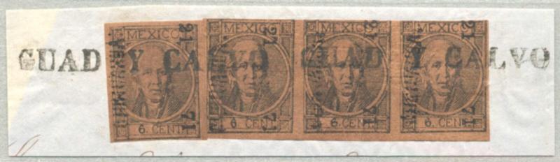 1871, 6 c.,black on buff paper, single stamp and strip of (3), on piece, with district opt. CHIHUAHUA, two clear strikes GUAD Y CALVO, two right stamps of strip are cut at top, other edges clear to large margins, still interesting and desirable, F-VF! Schätzpreis 800€.