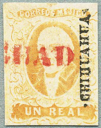1856, 1r, yellow orange, district name CHIHUAHUA, red used GUAD (Y CALVO), interesting and desirable, XF! Schätzpreis 200€.
