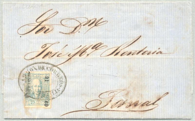 1869, 25c, blue, imperf, JALAPA district, on letter from JALAPA to VERACRUZ, cancelled with JALAPA cancel (Schatzke 596), ex Provera, signed A. Diena, exceptionally fresh and desirable entire, XF! Schätzpreis 400€.