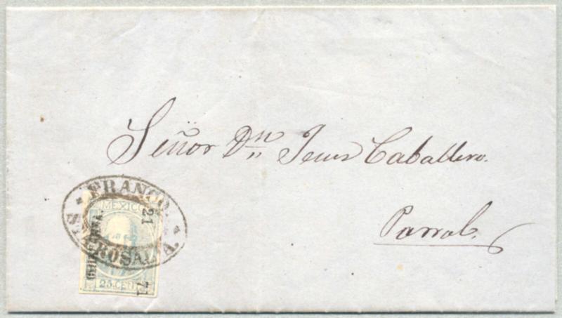 1870, 25c, blue, perforated, CHIHUAHUA district, on letter from TA ROSALIA to PARRAL, cancelled with FRANCO ROSALES (Schatzke 168), stamps with perforations are rare, only 3 months used in 1870, ex Provera, exceptionally fresh and desirable entire, XF! Schätzpreis 600€.