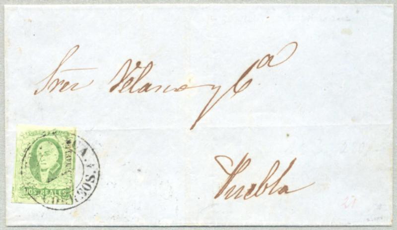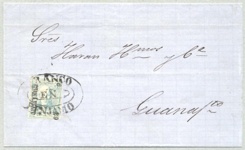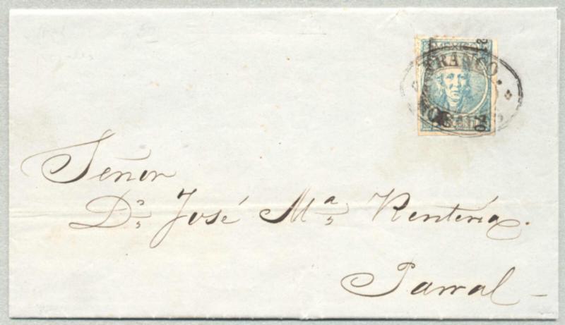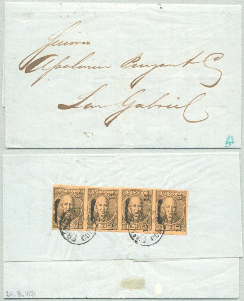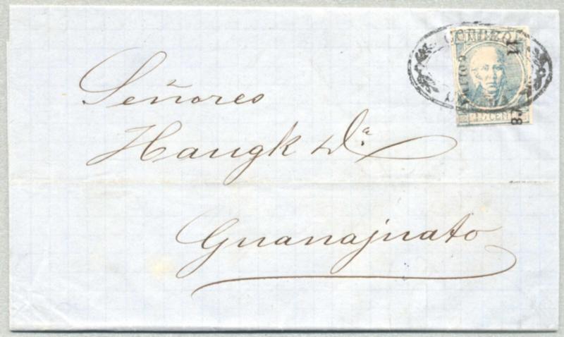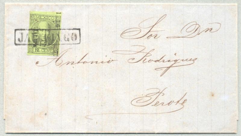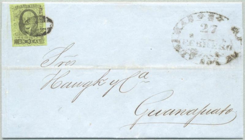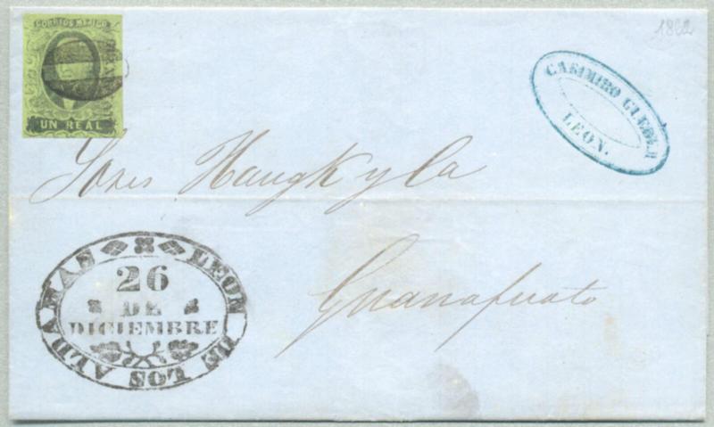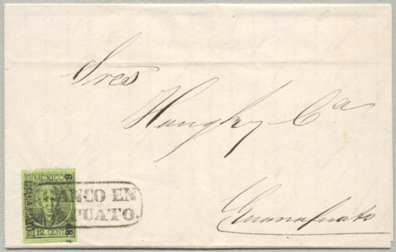 1861, 1r, grey-black on green, imperf, GUANAJUATO district, on letter from LEON to GUANAJUATO, stamp was cancelled on arrival with mute 0 from GUANAJUARO (Schatzkes 481) since dispatch LEON DE LOS ALDAMOS (Schatzke 500) was not struck on stamp, ex Provera, exceptionally fresh and interesting entire,