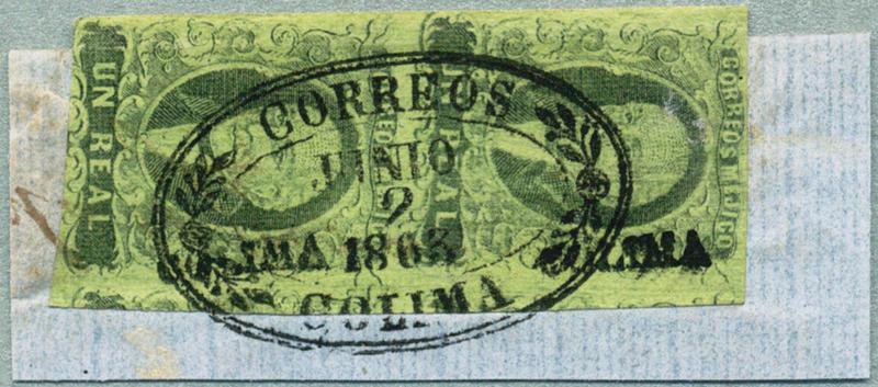 1861, 1 R, grey black/green, pair, on piece, COLIMA district name, luxury cancel oval COLIMA - Schatzkes 179, very fresh and desirable, XF! Schätzpreis 150€.