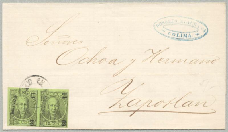 1870, 12c, black/green, horizontal pair, imperf, COLIMA district, on letter from COLIMA to ZAPOTLAN, cancelled with COLIMA (Schatzke 181), ex Provera, exceptionally fresh and desirable entire, XF! Schätzpreis 450€.