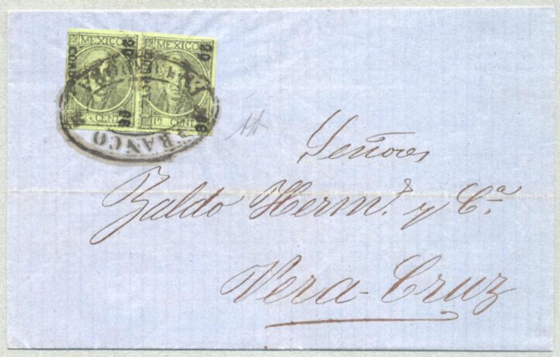 1871, 5+10+10c, (3), 10c as pair with perf not punched out, numerals wide apart, JALAPA district, on letter from JALAPA to VERACRUZ, cancelled with FRANCO EN JALAPA (not listed in Schatzkes, Schimmer VER 59/7 O1), ex Provera, fresh and desirable entire, VF-XF! Schätzpreis 800€.