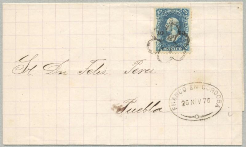 1876, 25c, blue, numerals wide apart, CORDOVA district, on letter from CORDOBA to PUEBLA, cancelled with mute flower and FRANCO EN CORDOBA (not listed in Schatzkes, Schimmer VER 37/3 - Rose of CORDOBA), reverse with arrival, ex Provera, exceptionally fresh and desirable entire, XF! Schätzpreis 600€.