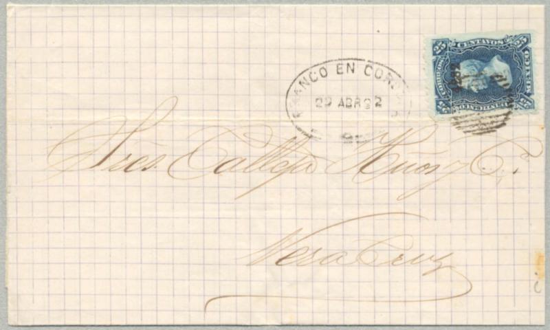 1882, 25c, blue, numerals close together at top, no district, on letter from CORDOBA to VERACRUZ, cancelled with FRANCO EN CORDOBA aside and mute cancel (not listed in Schatzkes, ), reverse with arrival, ex Provera, exceptionally fresh and desirable entire, XF! Schätzpreis 600€.