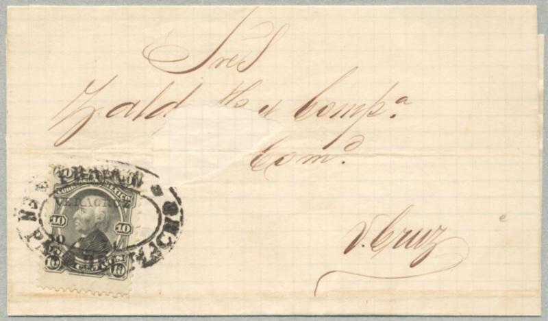 1874, 10c, black, numerals apart, VERACRUZ district, on letter from PASO DEL MACHO to VERACRUZ, cancelled FRANCO EN PASO DEL MACHO (Schatzkes 197a - listed under district CORDOVA!), ex Provera, letter front with big tear in center not affecting the stamp, interesting scarce cancel, VF! Schätzpreis 4