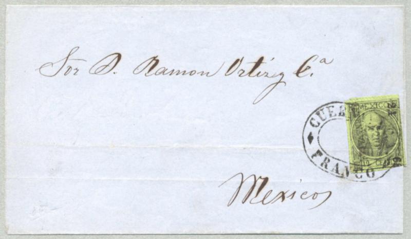 1856, first Hidalgo issue, 2 r, green, with district opt CUERNAVACA, with a clear strike of CUERNAVACA / CORREOS, used on cover to PUEBLA, fresh and desirable, VF-XF! Schätzpreis 500€.