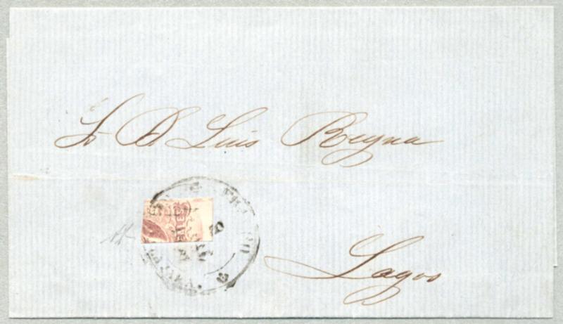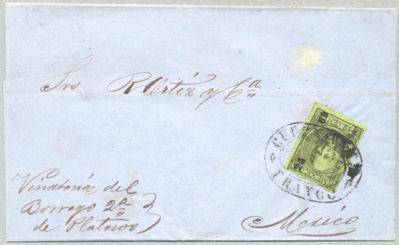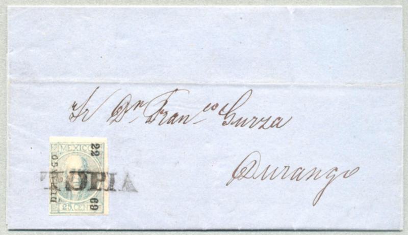 1869, 25c, blue, imperf, DURANGO district, on letter from TOPIA to DURANGO, cancelled with TOPIA (Schatzke 290), ex Provera, stamp ripped instead of cut, at left along the line, fresh and desirable entire, F-VF! Schätzpreis 500€.