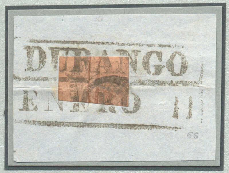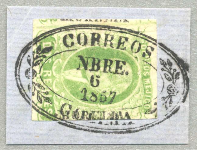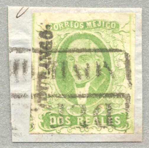 1856, first Hidalgo issue, 2 r, green, with district opt DURANGO, with partial strike of DURAN(GO), used on piece, very fresh and desirable, XF! Schätzpreis 120€.