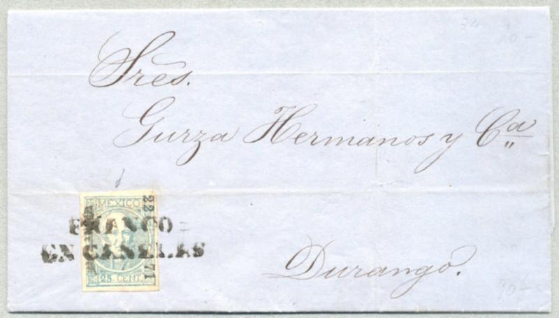 1871, 25c, blue, imperf, DURANGO district, gash below E of MEXICO, on letter from CANELAS to DURANGO, cancelled with FRANCO EN CANELAS, (Schatzkes 246), ex Provera, very fresh and desirable entire, XF! Schätzpreis 800€.